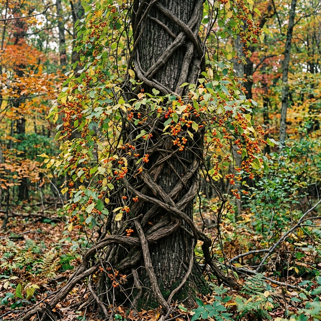 Woody VineThe most common and destructive invasive vine in our region. It wraps around tree trunks, strangles them, and adds weight that causes storm damage. Seeds spread by birds.